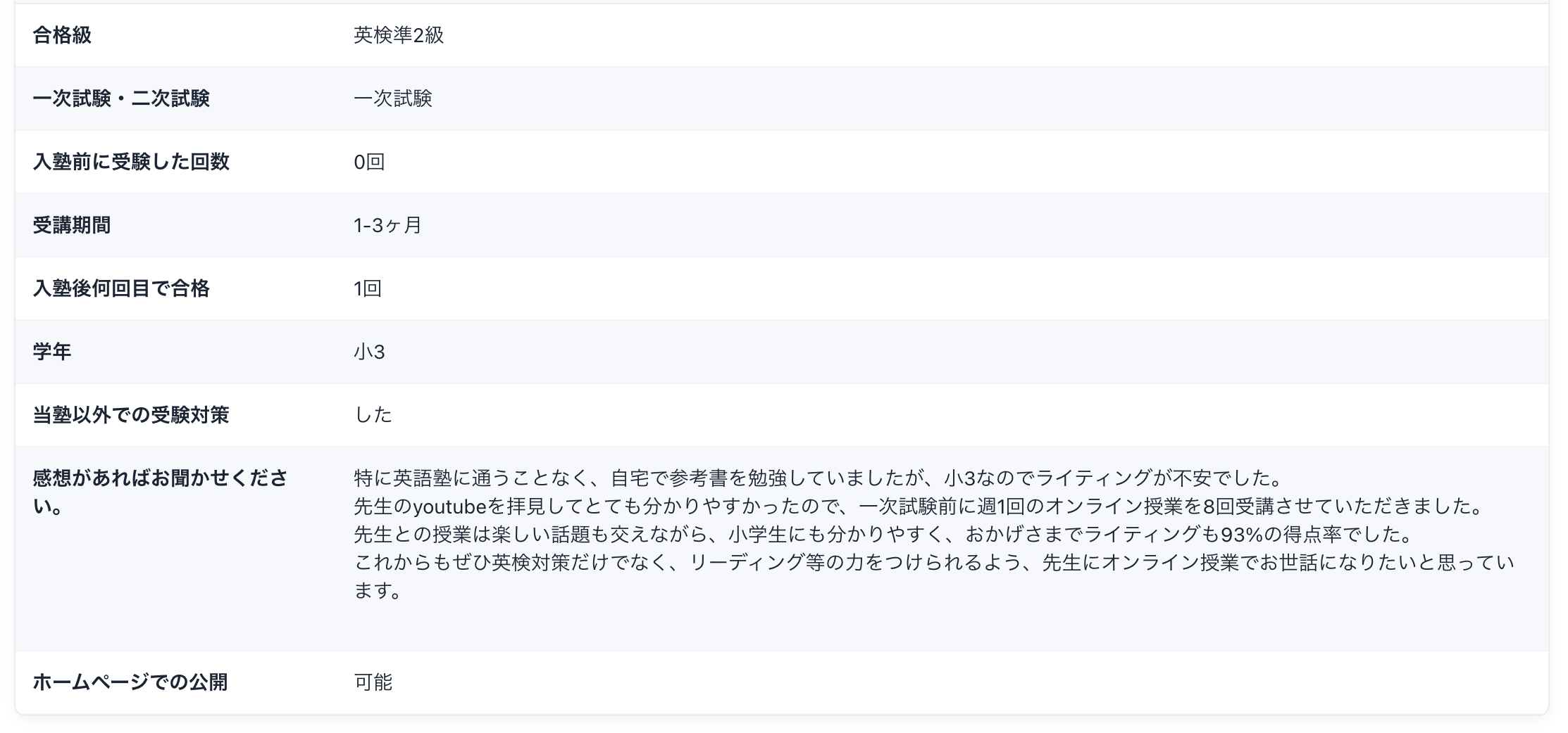 英検2級の授業の中で、英検準2級の面接対策を一度受講し、英検準2級の二次試験に合格しました。